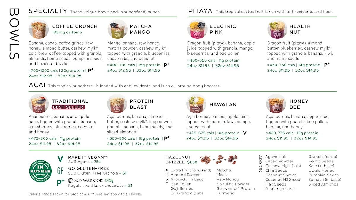 base: acai / banana / apple juice | toppings: kiwi / mango / coconut / granola